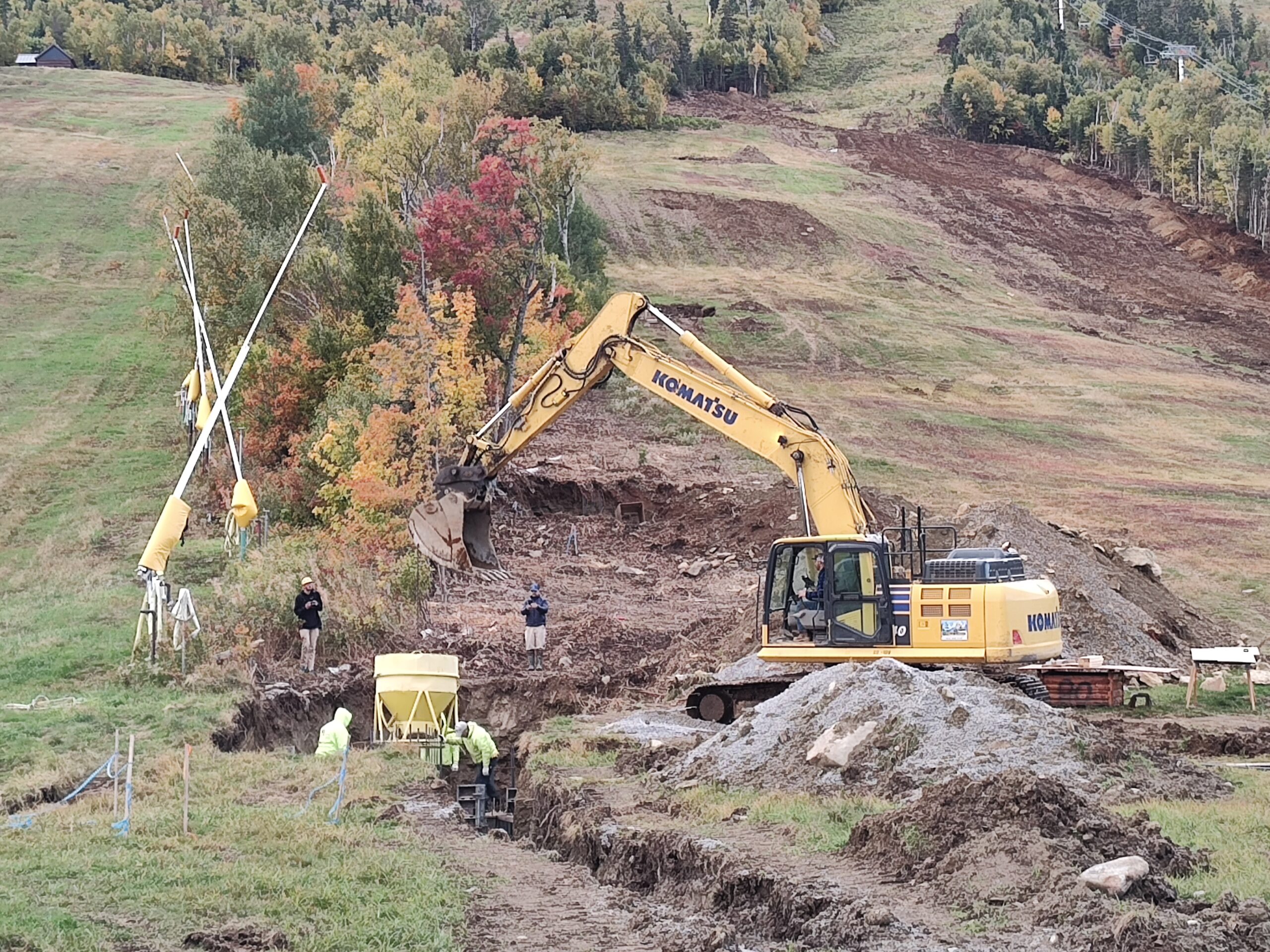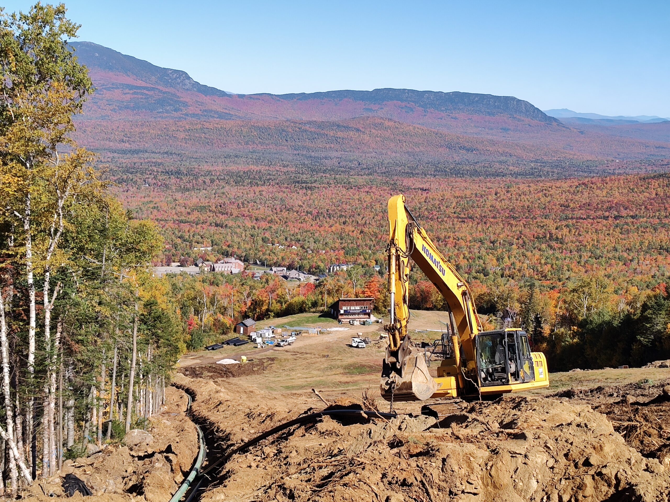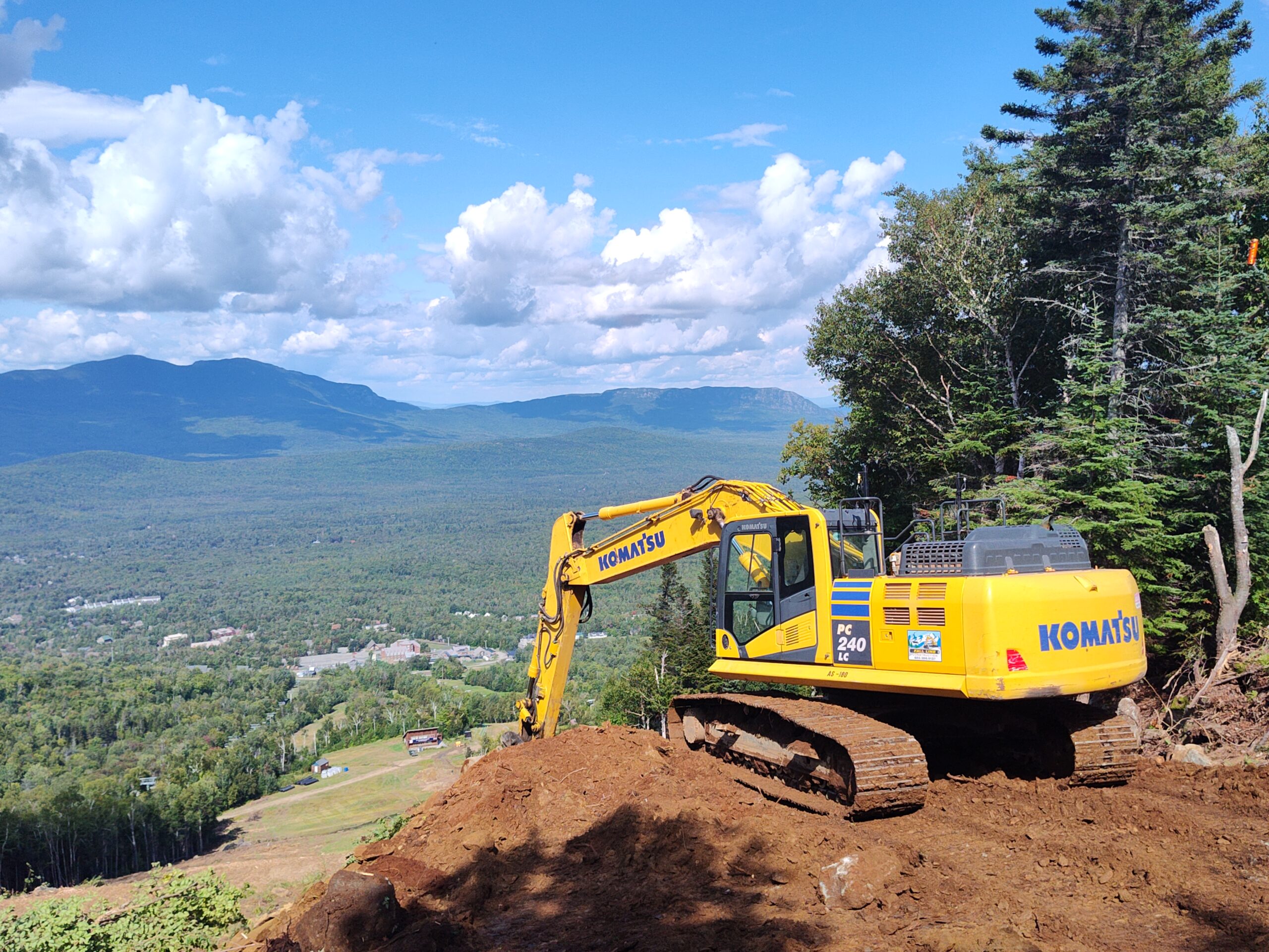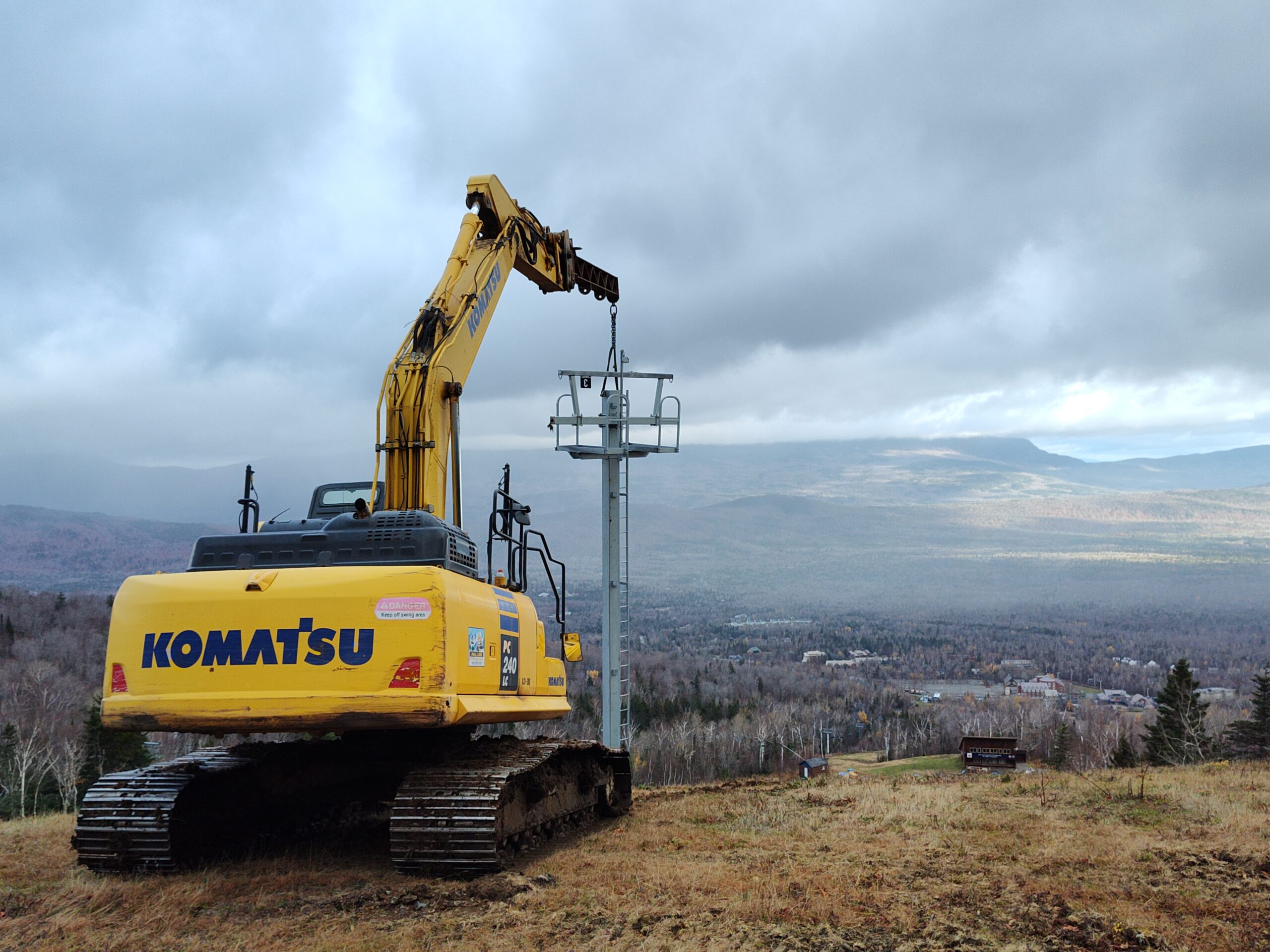 Excavator positioning lift components for high-speed surface lift installation along the fall line at Sugarloaf Mountain, enhancing Competition Hill.