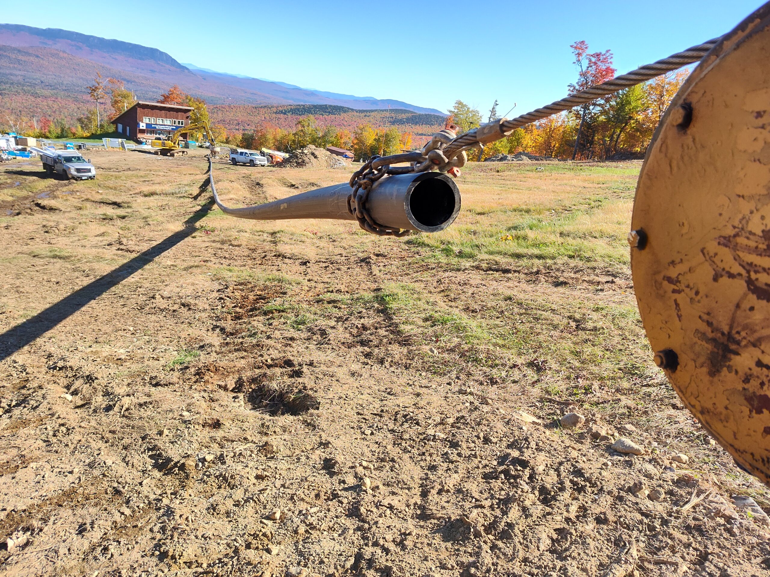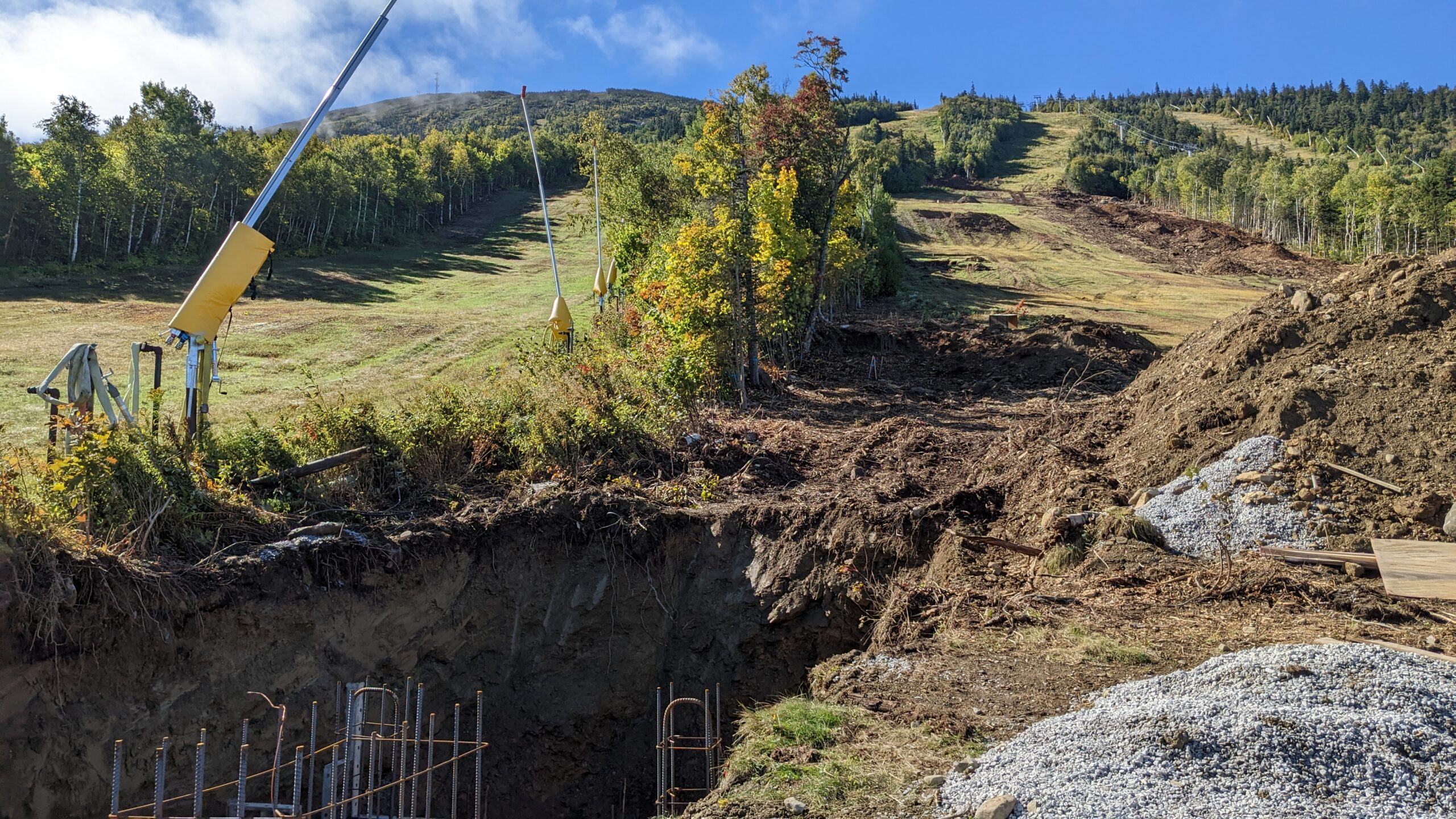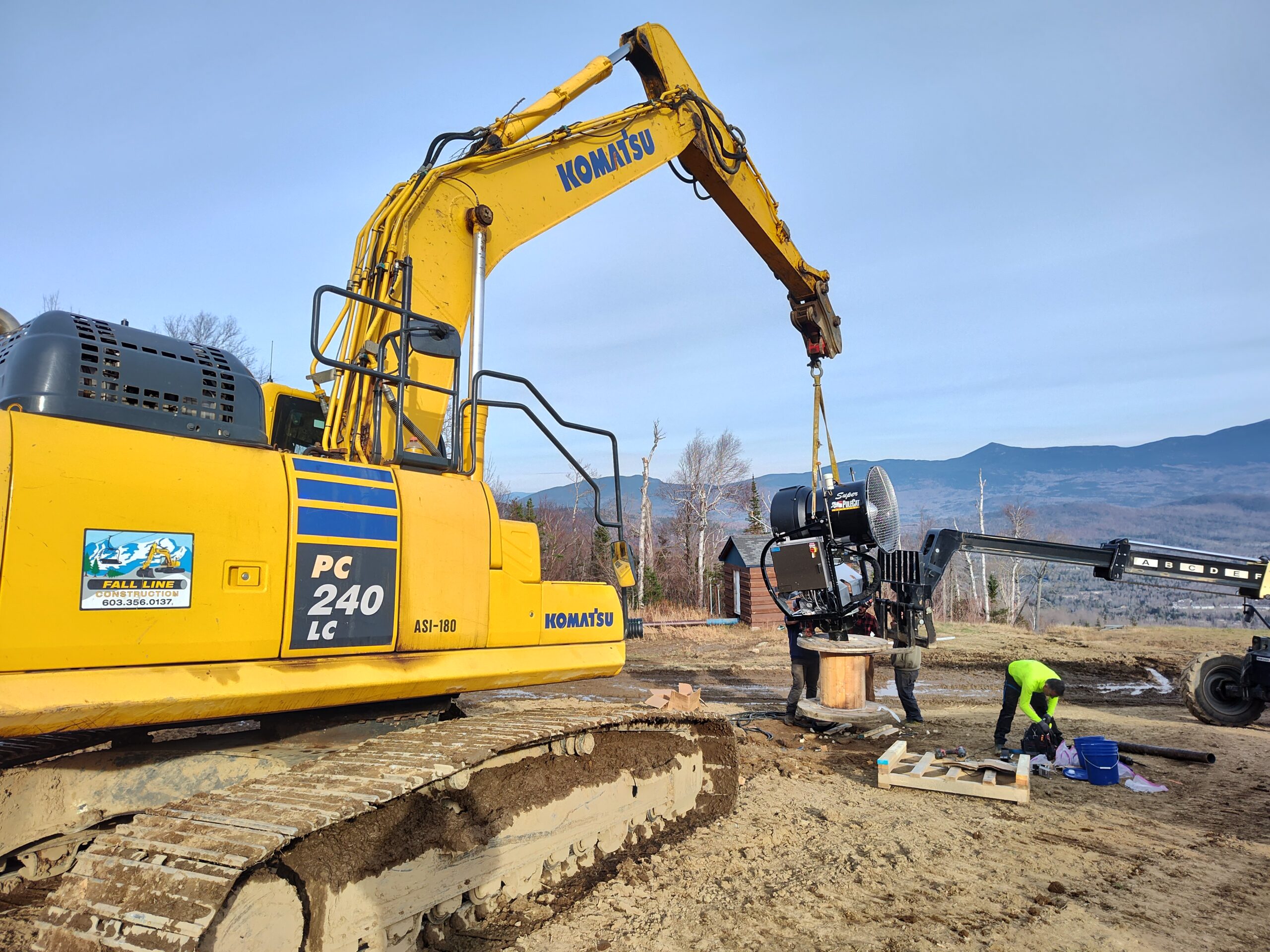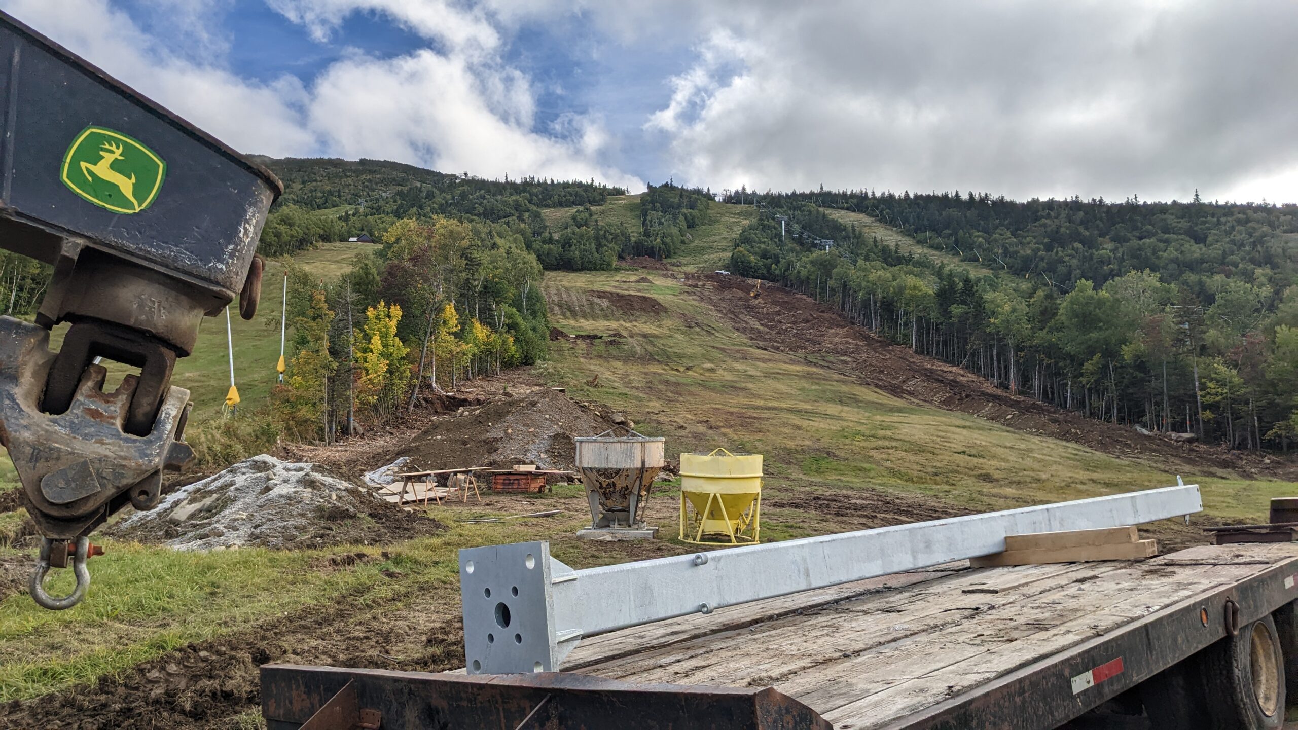 Excavator positioning lift components for high-speed surface lift installation along the fall line at Sugarloaf Mountain, enhancing Competition Hill.