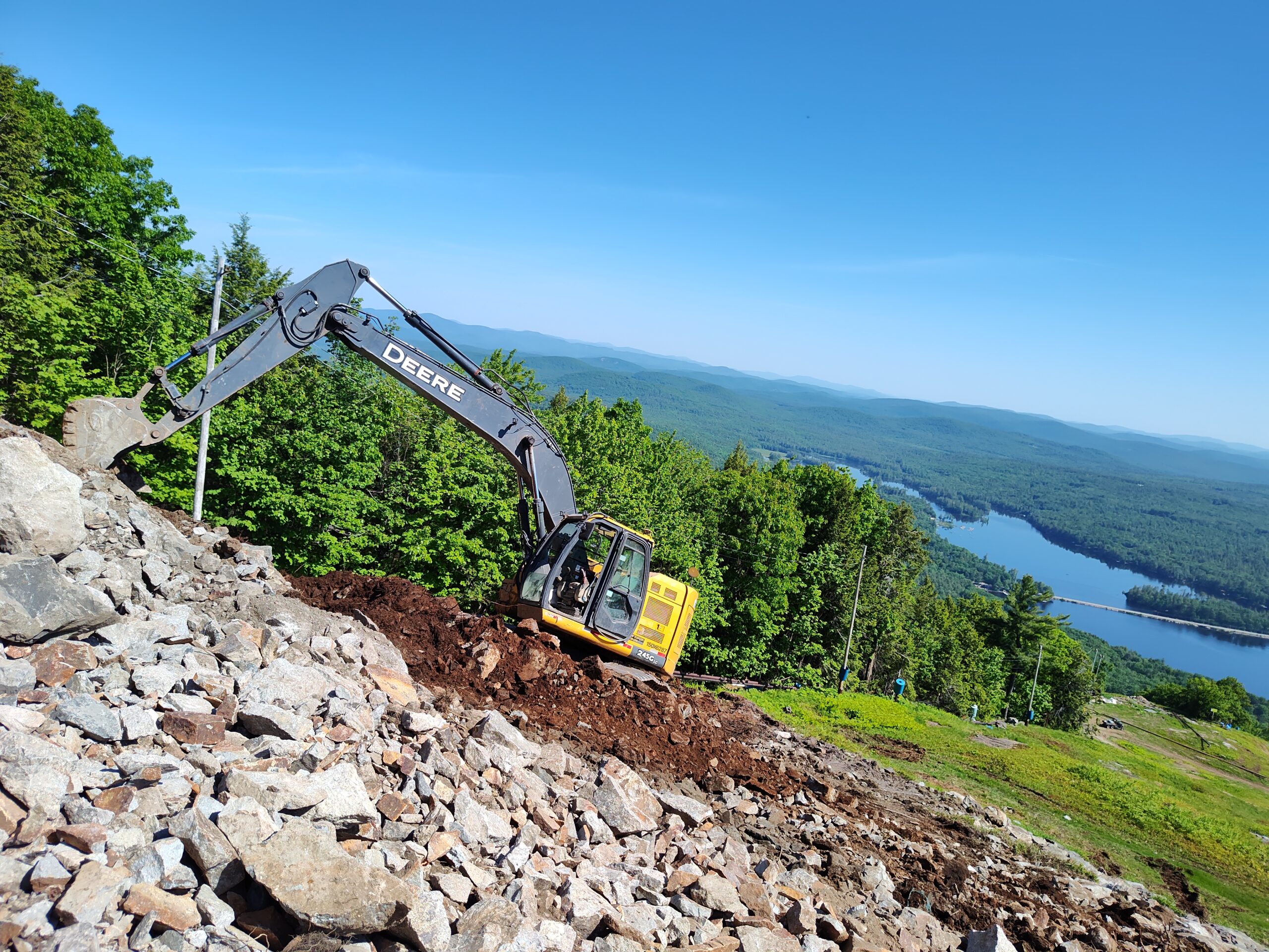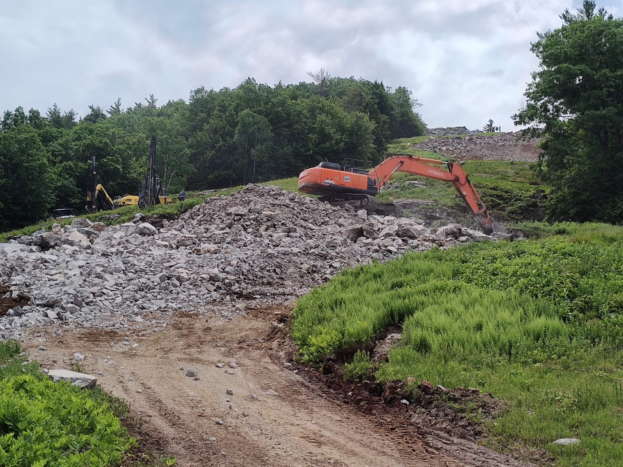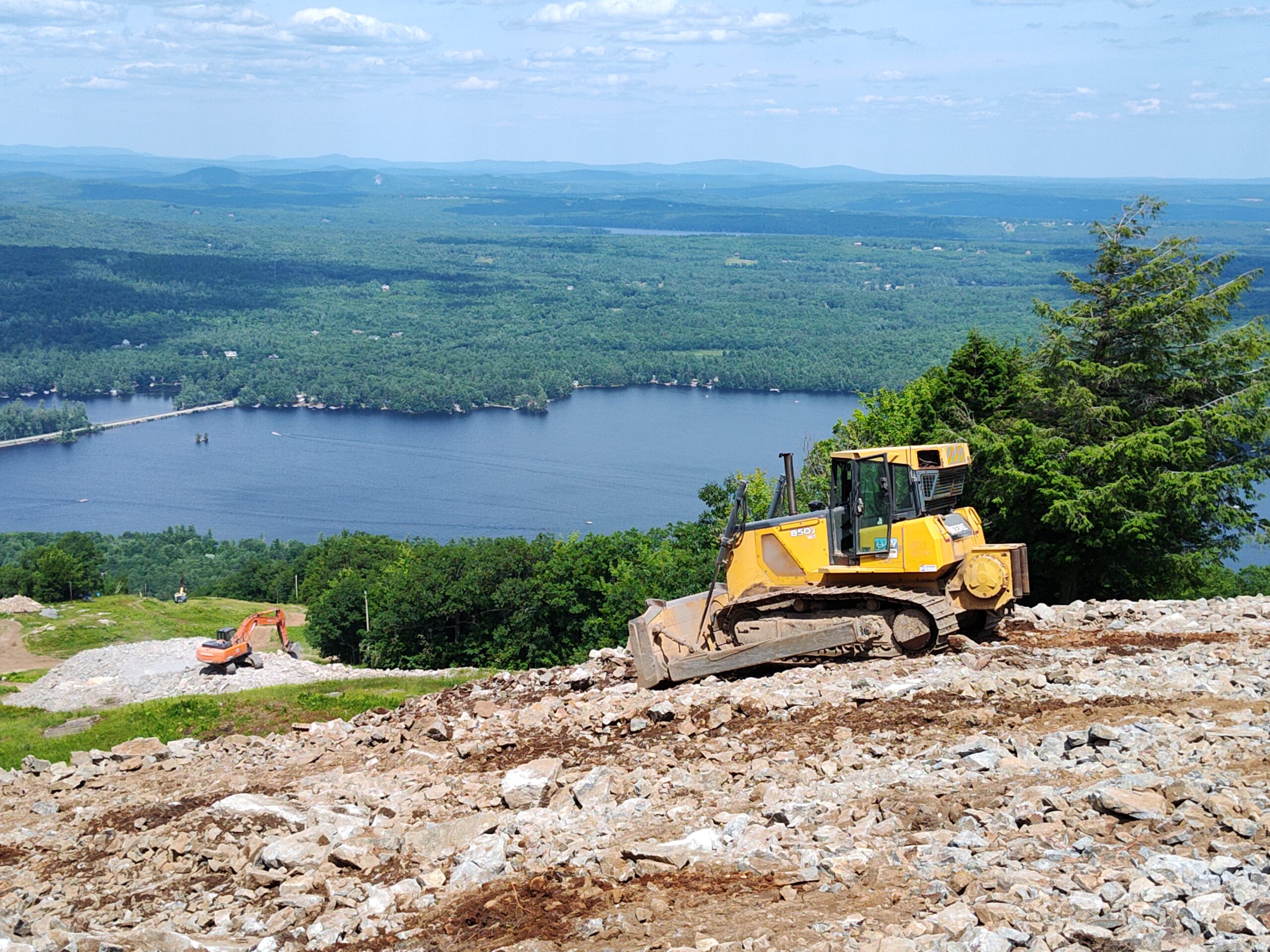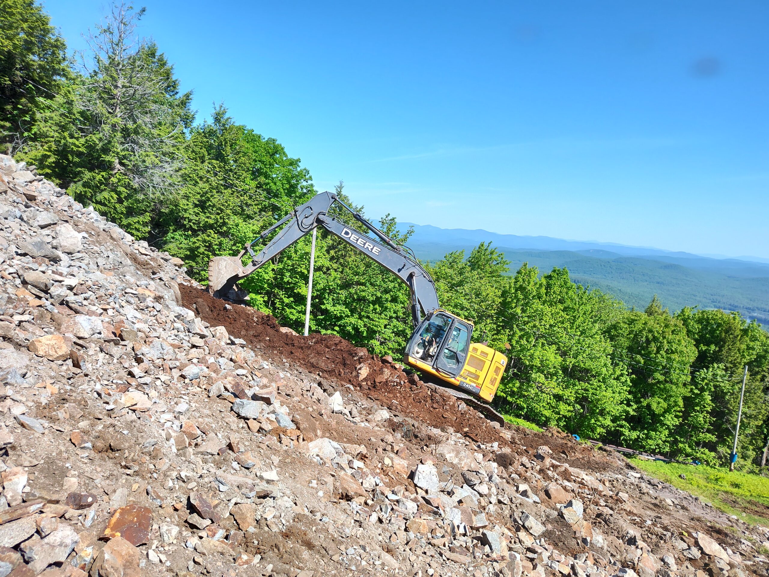 At Pleasant Mountain Ski Area in Bridgton, ME, Fall Line Construction provided excavation, grading, and snowmaking infrastructure improvements to support trail upgrades and lift expansion. The project required trenching for HDPE snowmaking pipe, drilling and blasting ledge, and stabilizing steep slopes to create safe and durable foundations. Our team coordinated heavy excavation, pipe handling, and concrete foundation support — including aerial placement of components and concrete by helicopter — to deliver the work safely and on schedule.
