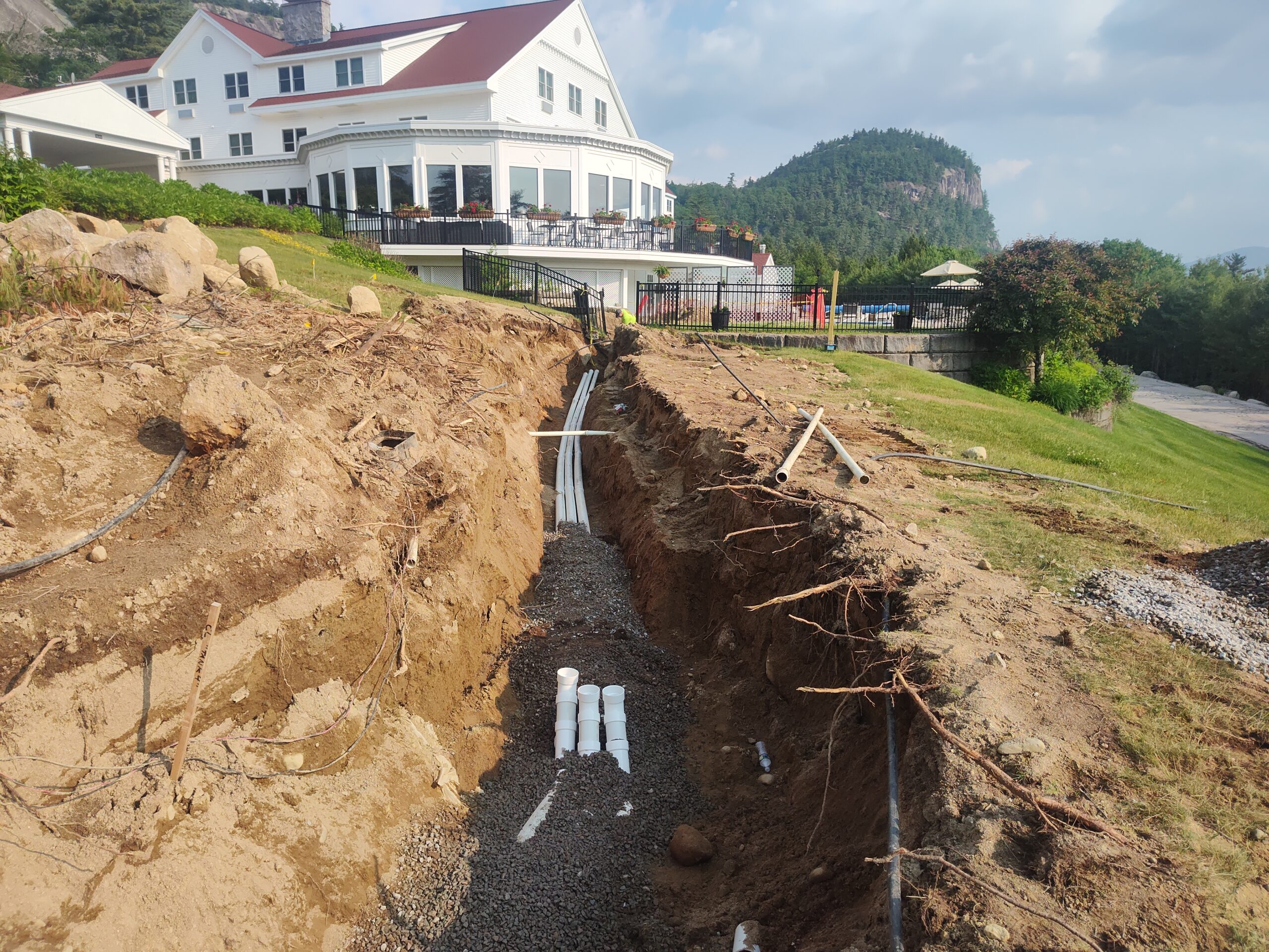 At the White Mountain Hotel & Resort in North Conway, NH, Fall Line Construction provided comprehensive excavation and civil support for critical utility upgrades and site improvements during a major property renovation. Our scope included expert trenching for a new septic system, precision grading around high-traffic hotel grounds, and detailed site preparation throughout the adjacent golf course.
